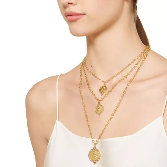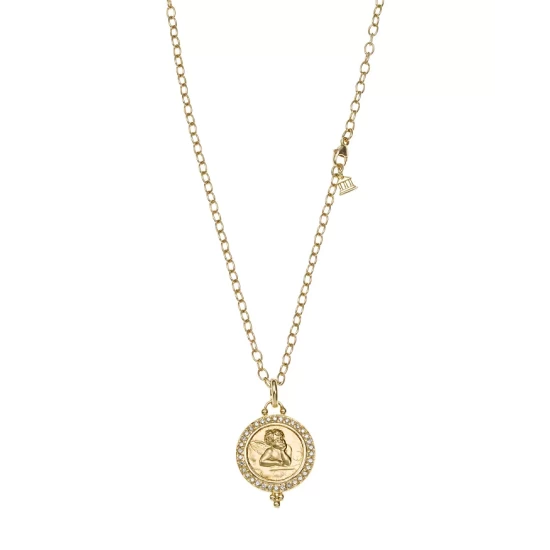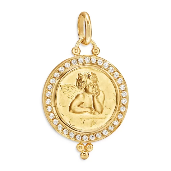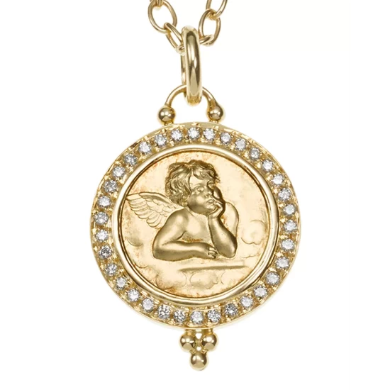 18K yellow gold medallion, surrounded by diamond pavé and etched with a thoughtful angel. By Temple St. Clair.