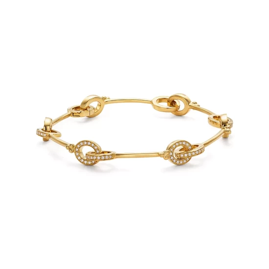 - Interlocking diamond circles on a polished 18K yellow gold bracelet