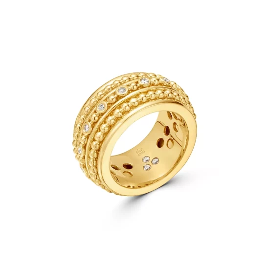 - Wide polished gold ring decorated with bezel-set diamonds and beading