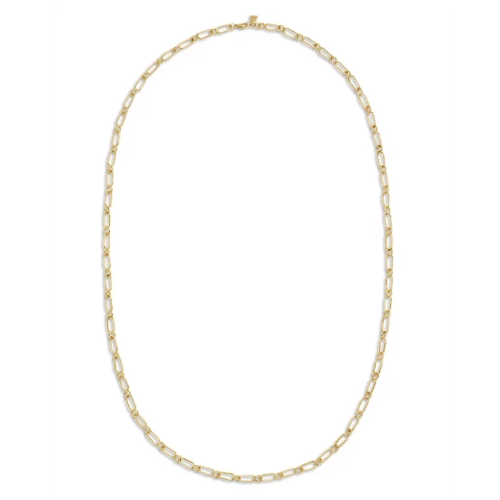 - A long length open river link chain necklace in 18K yellow gold
