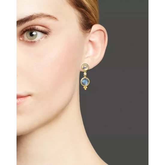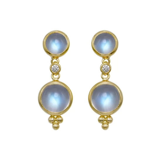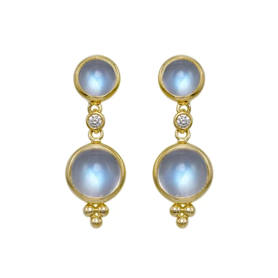 Crafted in 18K yellow gold, this pair of double-drop earrings from Temple St. Clair features royal moonstone gemstones and diamond embellishment.
